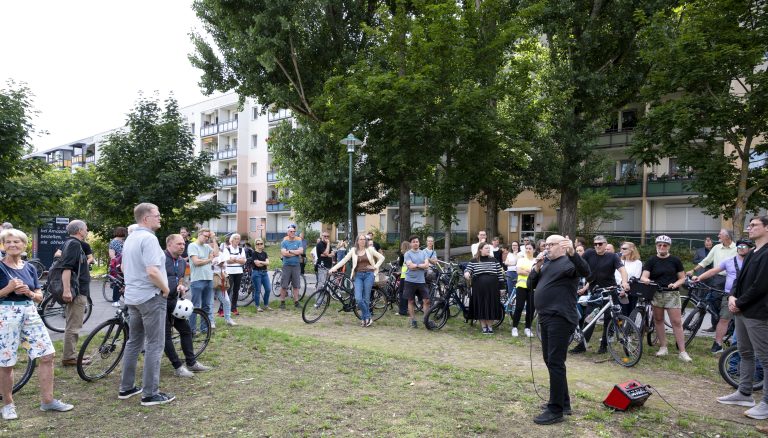 Nur 10 Radminuten später konnte dann der Kontrast nicht größer sein, als es in die Plattenbausiedlung Schlaatz ging. Und doch zeigte sich auch hier vor dem Beteiligungsprojekt des Planlabors am Marktplatz, wie wichtig Genossenschaften wie die PWG 1956, die pbg und die WG Karl Marx für die nachbarschaftliche Zusammenarbeit gerade in sozial vielfältigen Nachbarschaften sind.