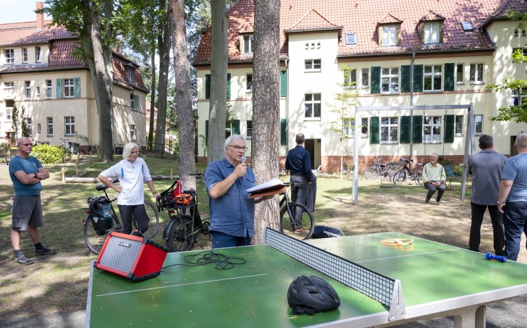 Bei der ältesten Genossenschaft Potsdams, der Kolonie Daheim von 1894, konnten sich die Radfahrenden anschließend bei einer (durch die Mitglieder organisierten) Trinkpause ein konkretes Bild davon machen, wie lebendig genossenschaftliche Selbsthilfe und Gemeinschaft auch nach 130 Jahren noch ist.